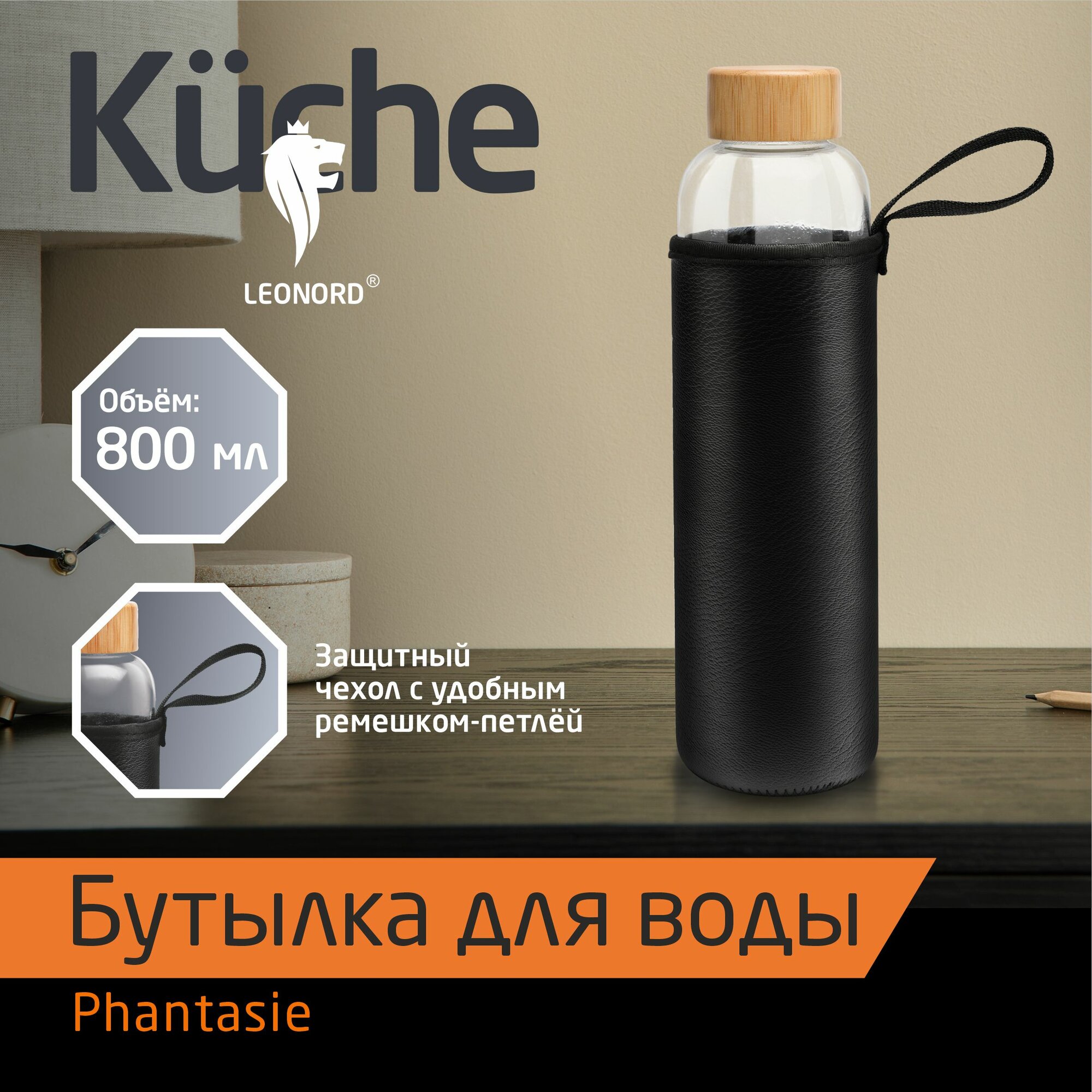 Бутылка для воды из термостойкого стекла в чехле с бамбуковой крышкой Leonord Phantasie, 800 мл информация: