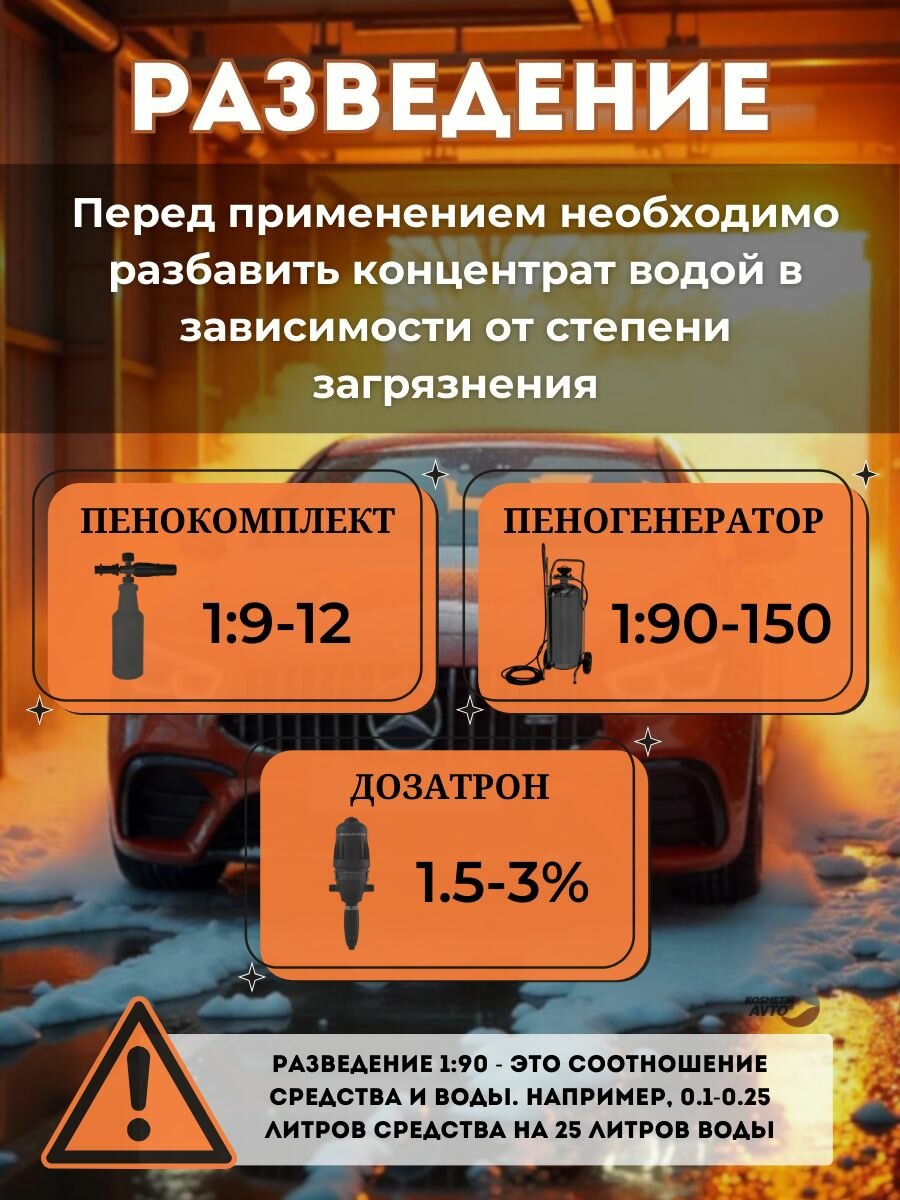 | Способ применения | Приготовить рабочий состав разбавив с водой. Для пенокомплекта 1:4 - 1:5, для пеногенератора 1:100, в системах дозирования (дозатрон) 1,5-3% в зависимости от степени загрязнения и жесткости воды. После нанесения рабочего состава на кузов автомобиля выждать 2-3 минуты и смыть под высоким давлением при помощи АВД. |