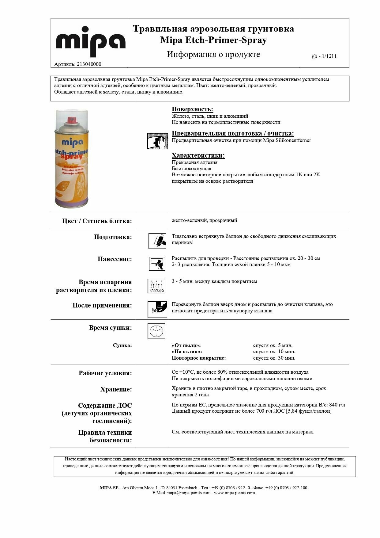 MIPA Грунт автомобильный кислотный желто-зеленый Wash/Etch primer 400 мл информация: