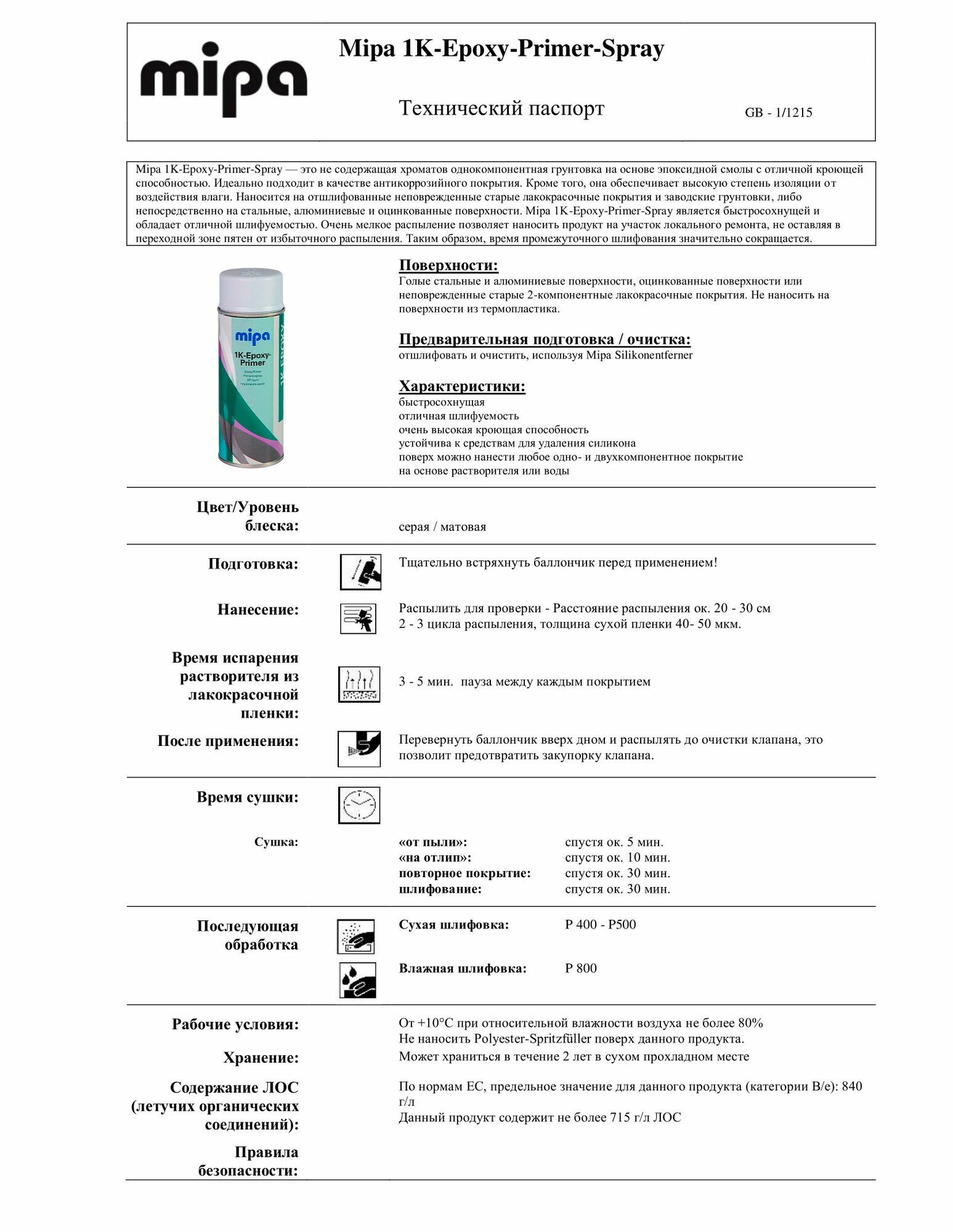 MIPA Эпоксидный грунт 1K-Epoxy-Primer серый 400 мл информация: