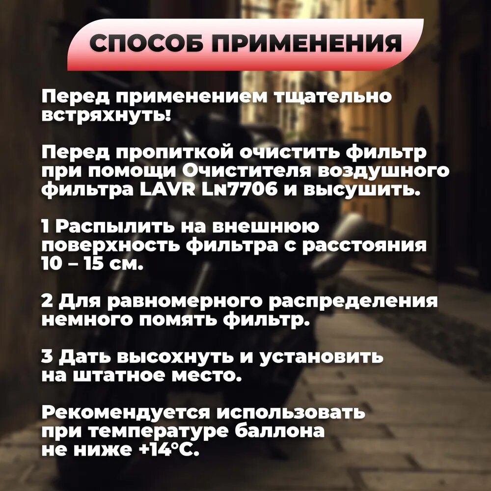 Пропитка для воздушного фильтра мотоцикла, 400 мл LAVR MOTO, 400 мл / Ln7708 информация: