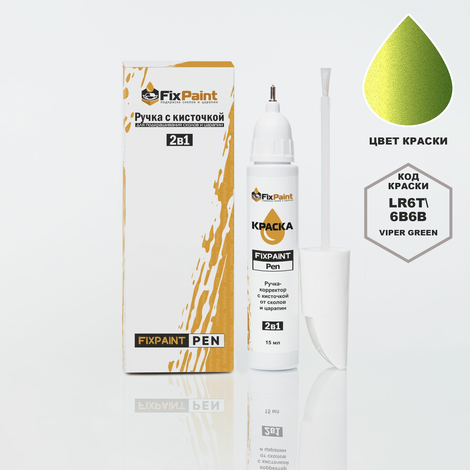 Подкраска VOLKSWAGEN TRANSPORTER, код 6B, R6T, LR6T, 6B6B, VIPER GREEN, ручка-корректор с кисточкой 2 в 1 FixPaint Pen 15 мл, эмаль для ремонта сколов и царапин информация: