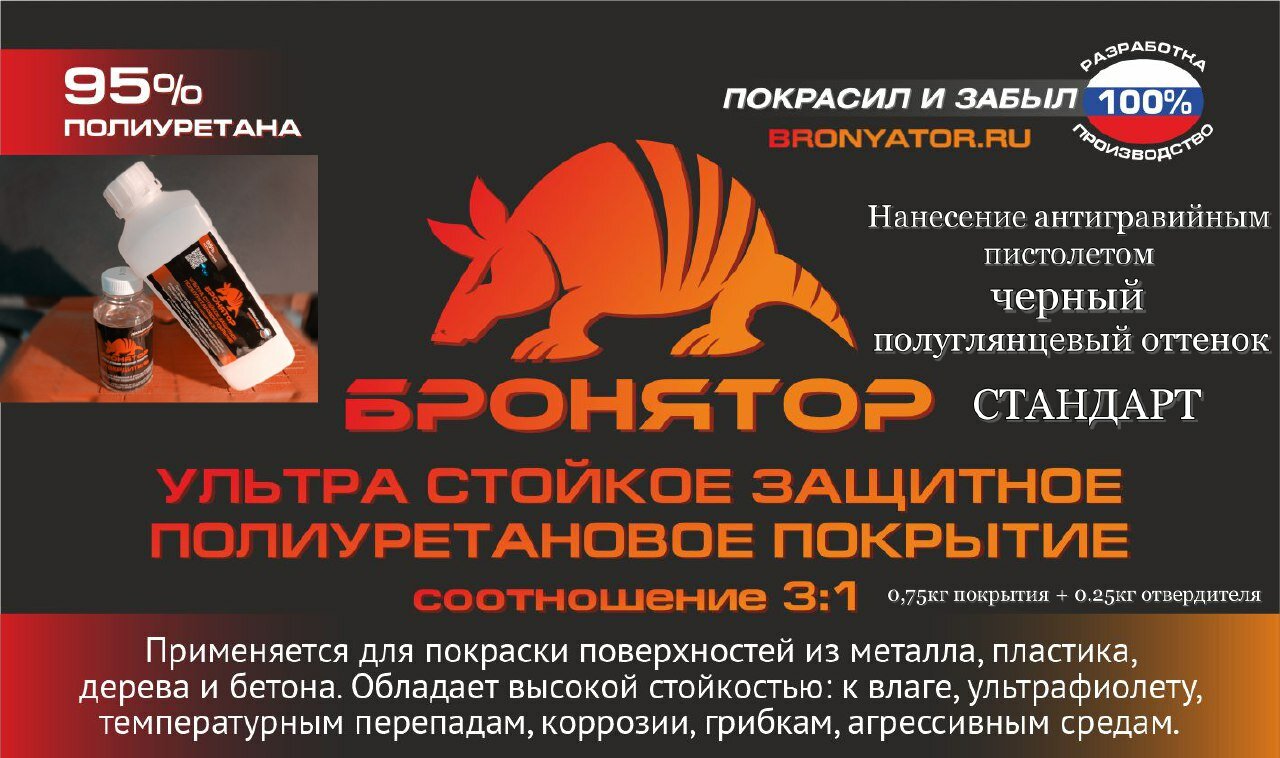 Ультра прочное защитное покрытие Бронятор Стандарт (содержание полиуретана 95%) 3:1 ПУ, 1кг/комплект, полуглянцевое, черное, в евробаллоне информация: