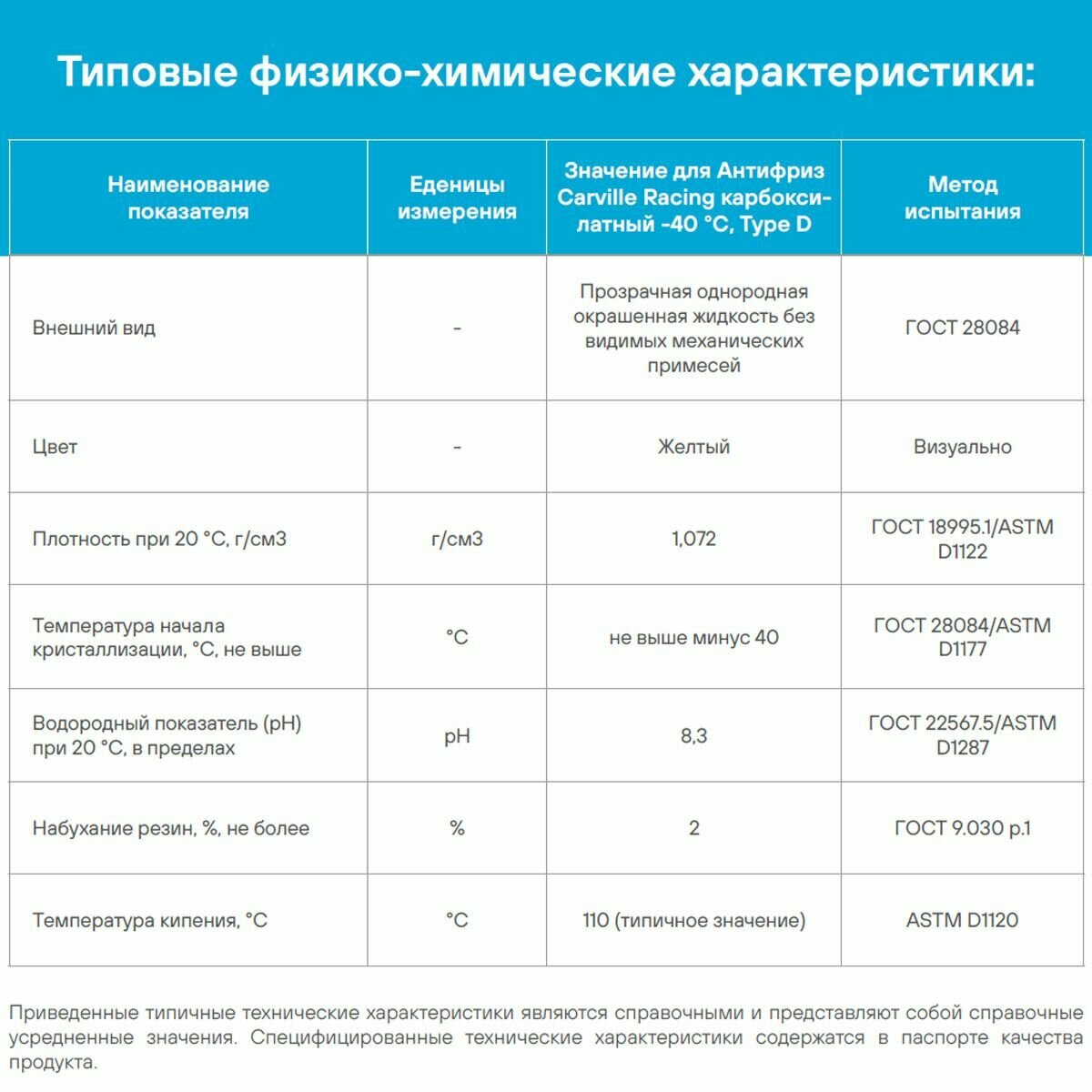 Антифриз готовый CARVILLE RACING карбоксилатный желтый флуоресцентный -40 С Type D L2018535, 1 кг информация: