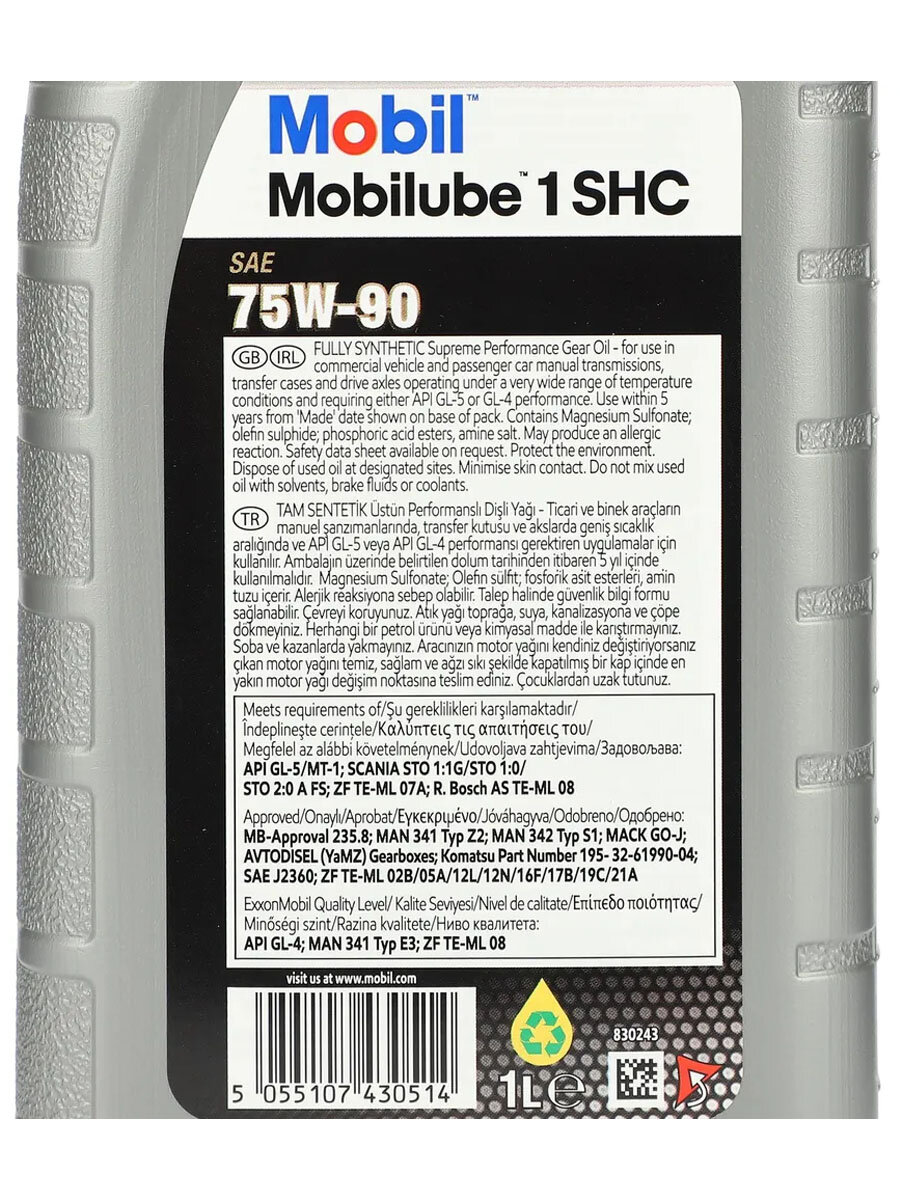 Масло трансмиссионное Mobilube 1 SHC 75W-90 синтетическое 1л информация: