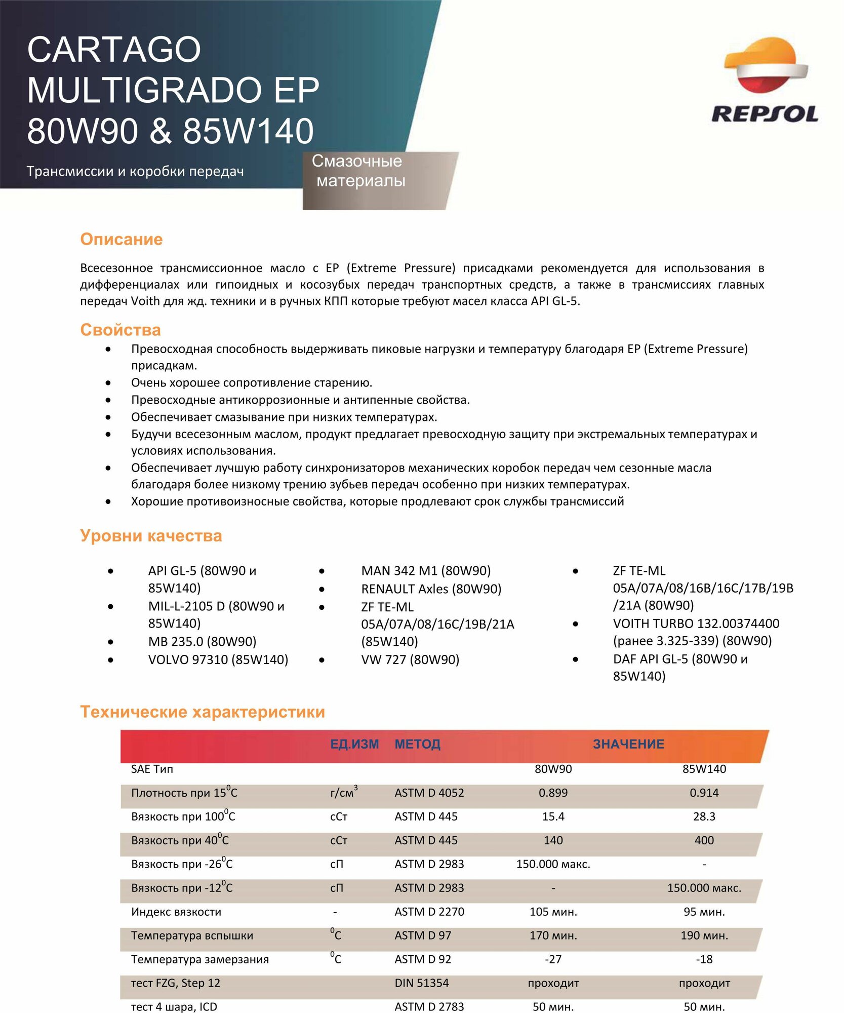 Трансмиссионное минеральное масло Repsol CARTAGO MULTIGRADO EP 80W90 информация: