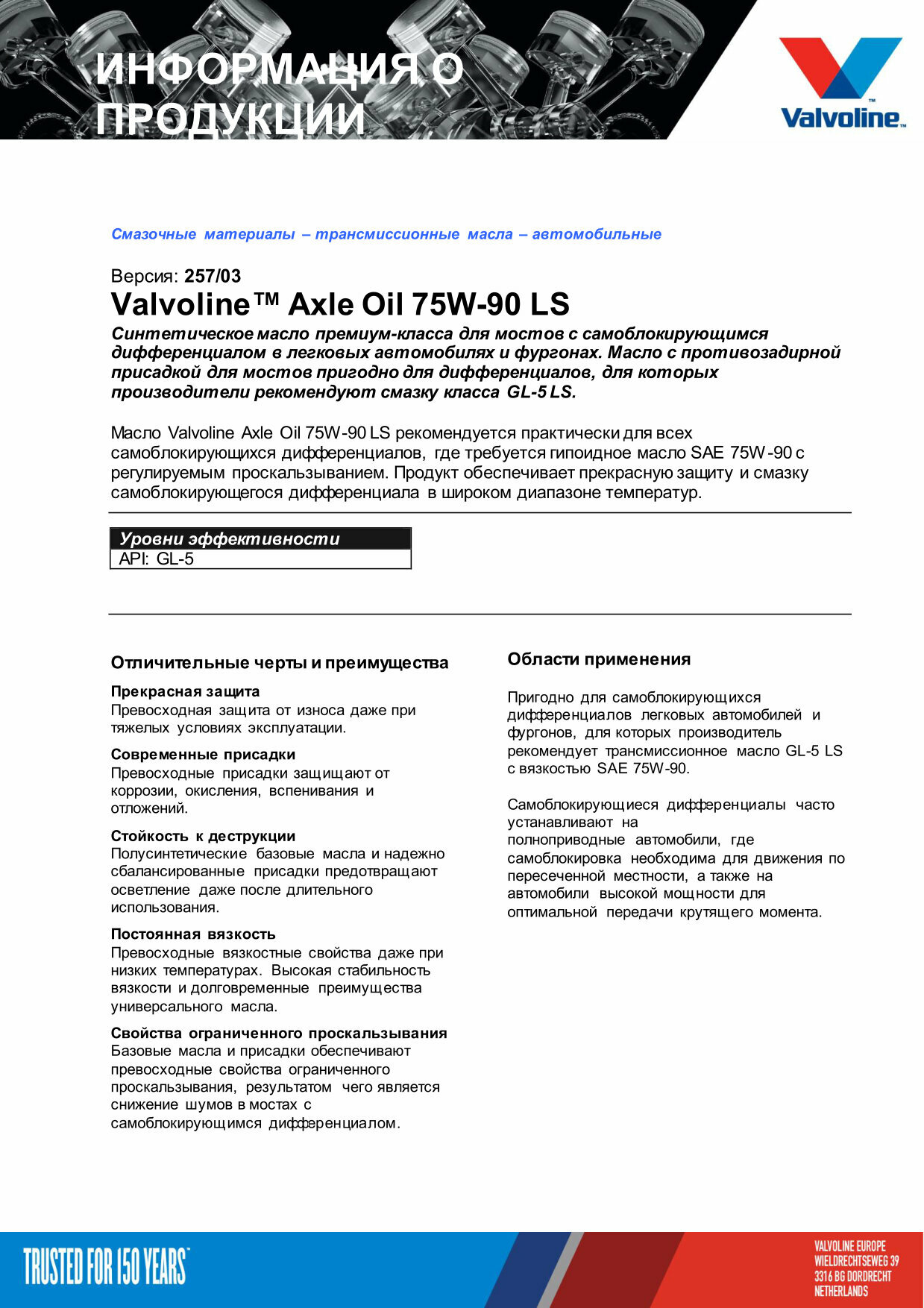 Трансмиссионное синтетическое масло Valvoline AXLE Oil LS 75W90 информация: