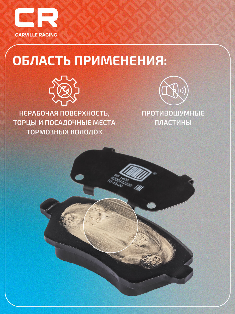 | Область применения | Нерабочая поверхность / торцы и посадочные места тормозных колодок Противошумные пластины |