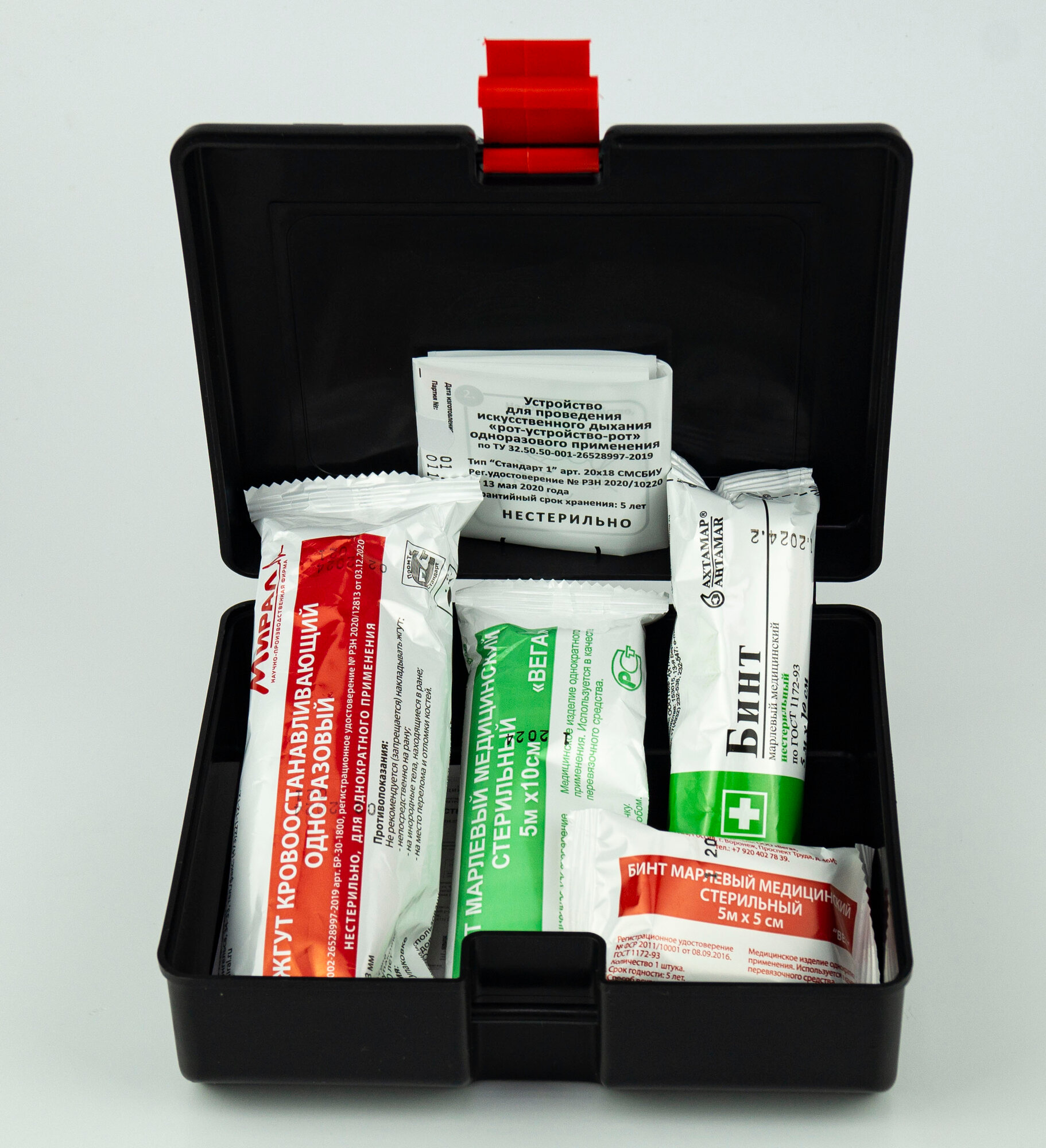 | Состав | Жгут - 1 шт, Бинт - 3 шт, Устройство для проведения искусственного дыхания - 1 шт, Маска - 1 шт. |