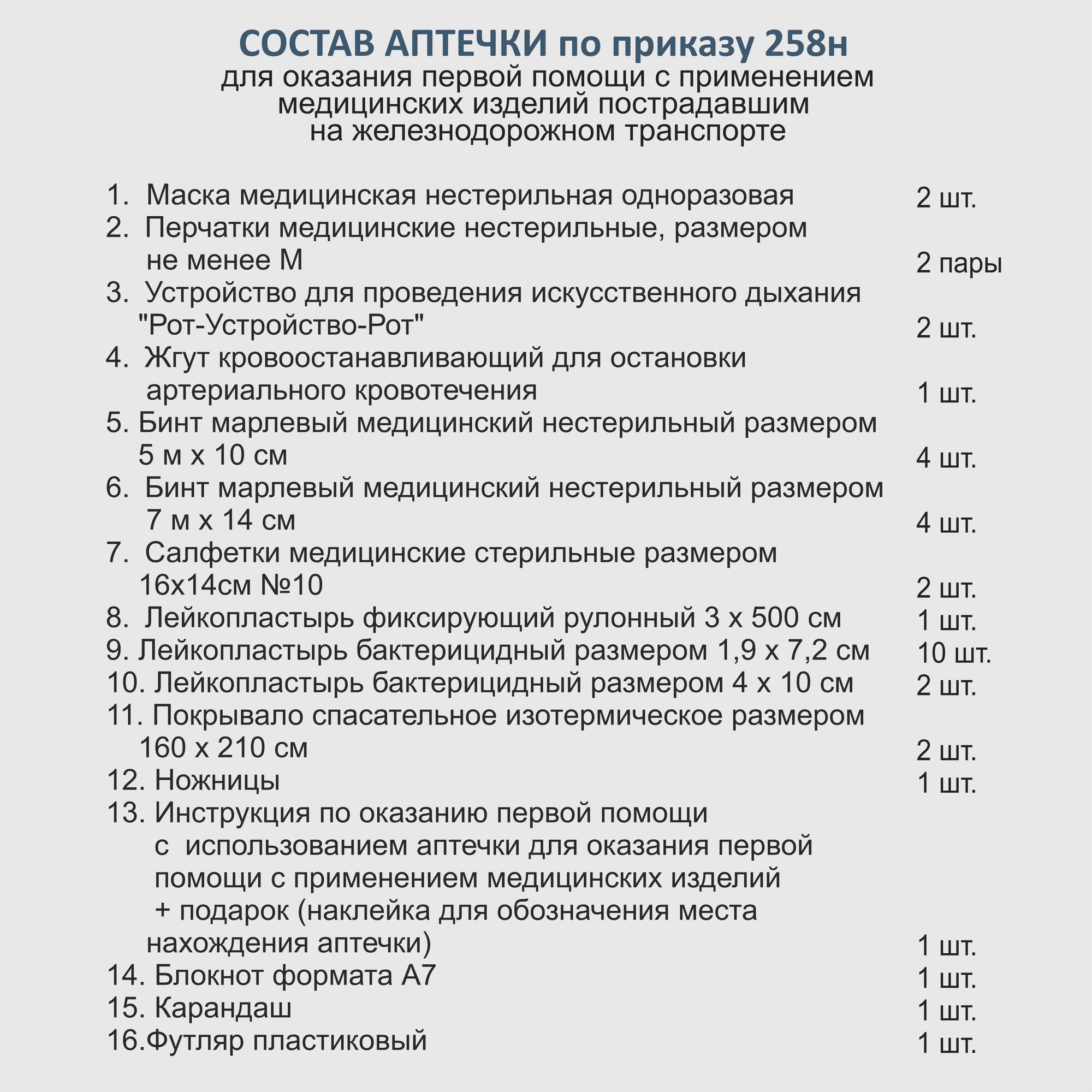 Аптечка для поездов пригородного сообщения и вагонов дальнего следования по новому приказу 258-н 2024 г.