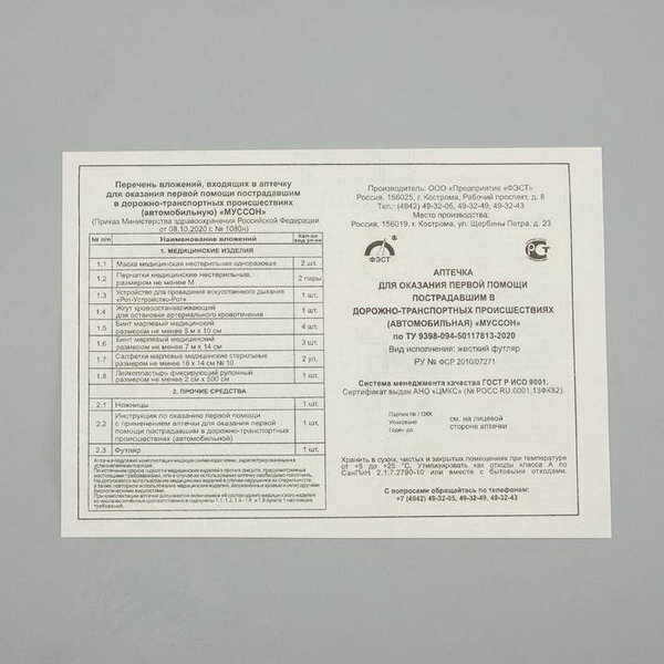 Аптечка автомобильная ФЭСТ футляр из полистирола, новый состав по приказу № 1080Н от 08.10.20