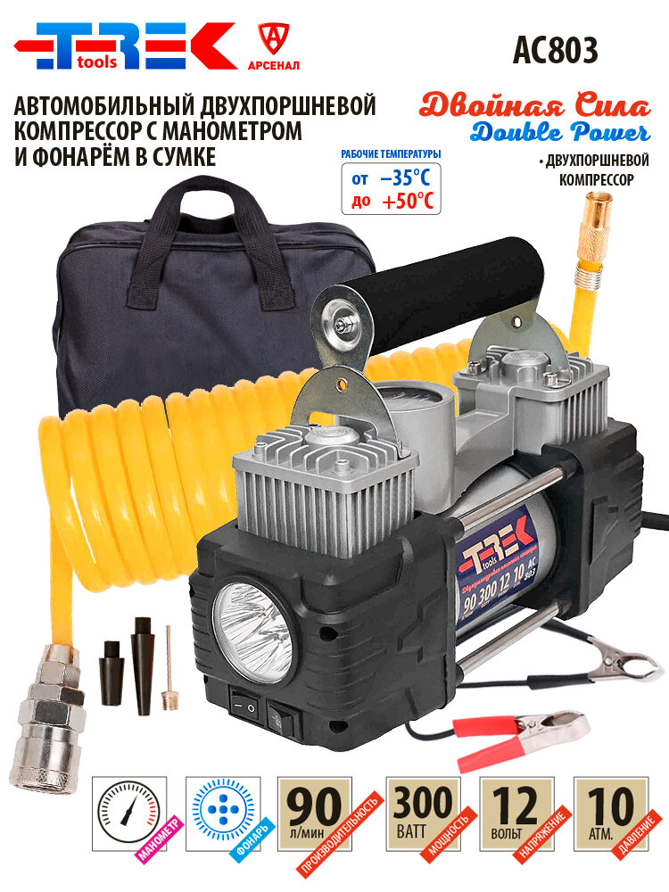 Компрессор автомобильный двухпоршневой 90л/мин с ФОНАРЁМ в сумке TREK, 803 информация: