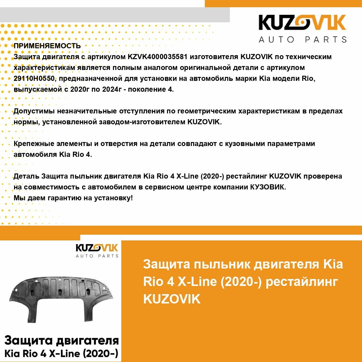 Защита пыльник двигателя Киа Рио Kia Rio 4 X-Line (2020-) рестайлинг информация: