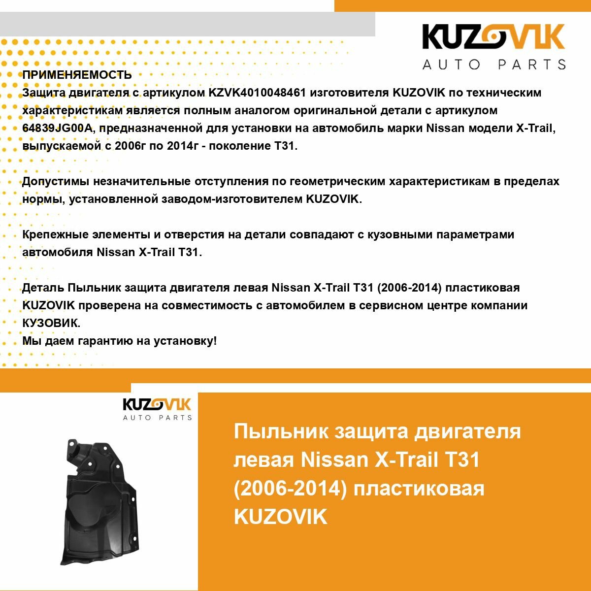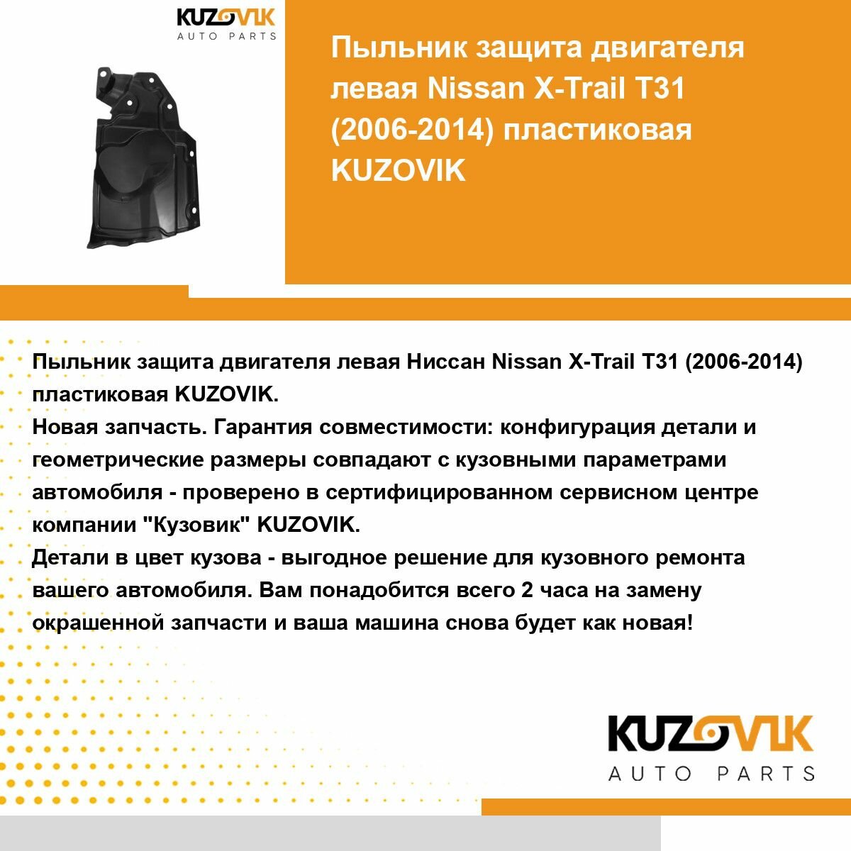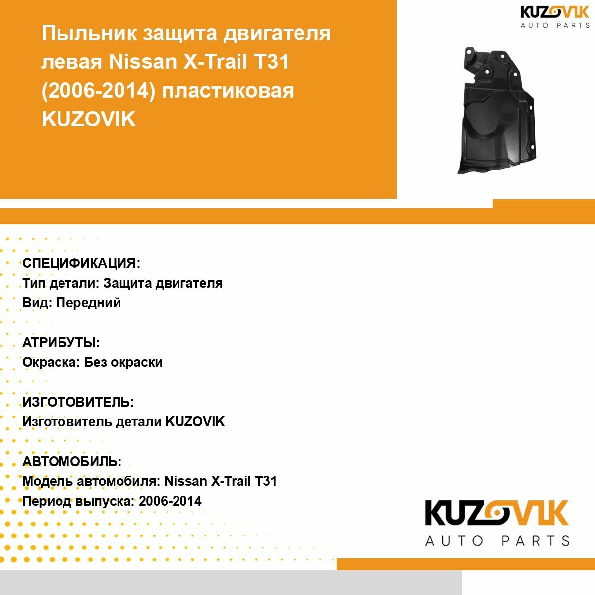 | Подробная комплектация | Защита пыльник двигателя, моторного отсека для Ниссан Икс-Трейл Nissan X-Trail T31 (2006-2014) пластиковый левый |