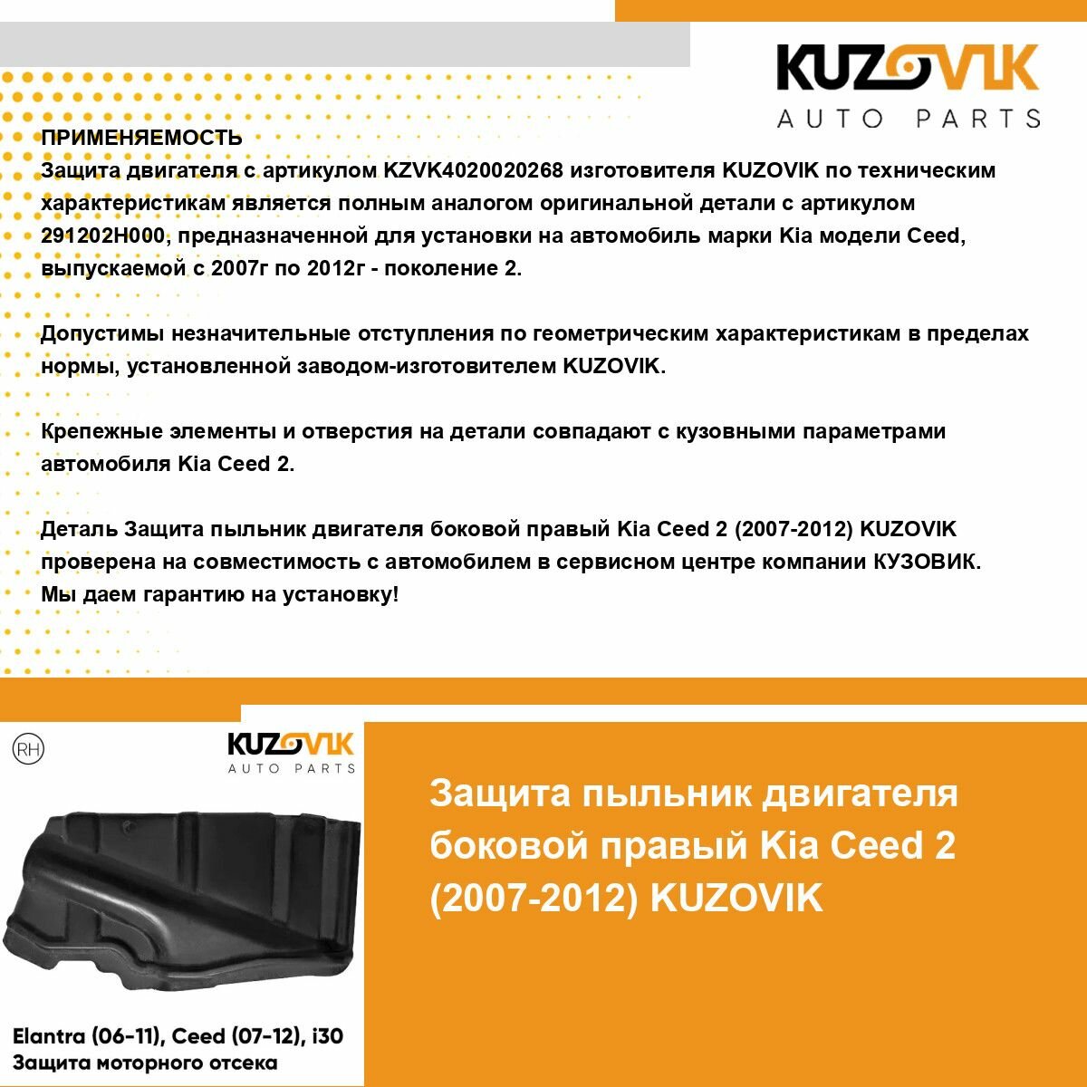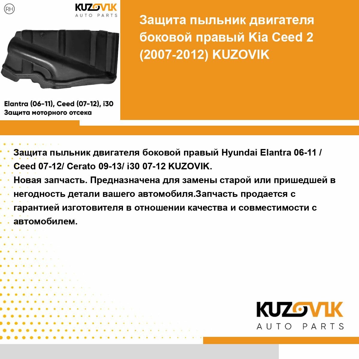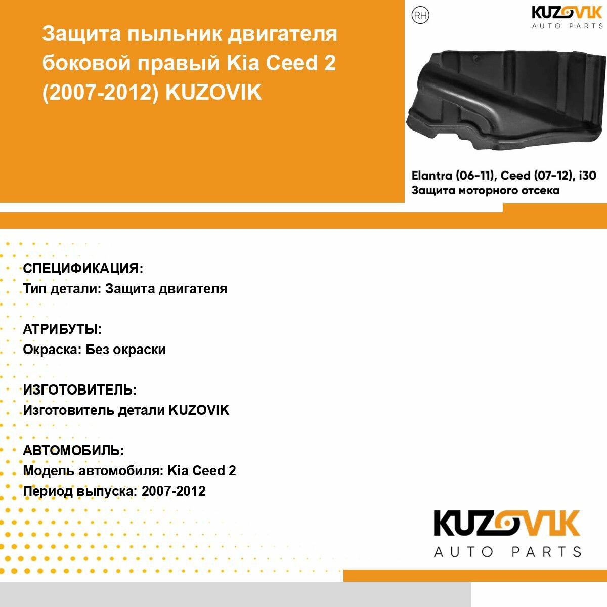 Отзывы на Пыльник защита моторного отсека двигателя правый боковой Hyundai Elantra Хендай Элантра (06-11)/ Ceed Сид (07-12)/ Cerato Церато (09-13)/ i30 (07-12)