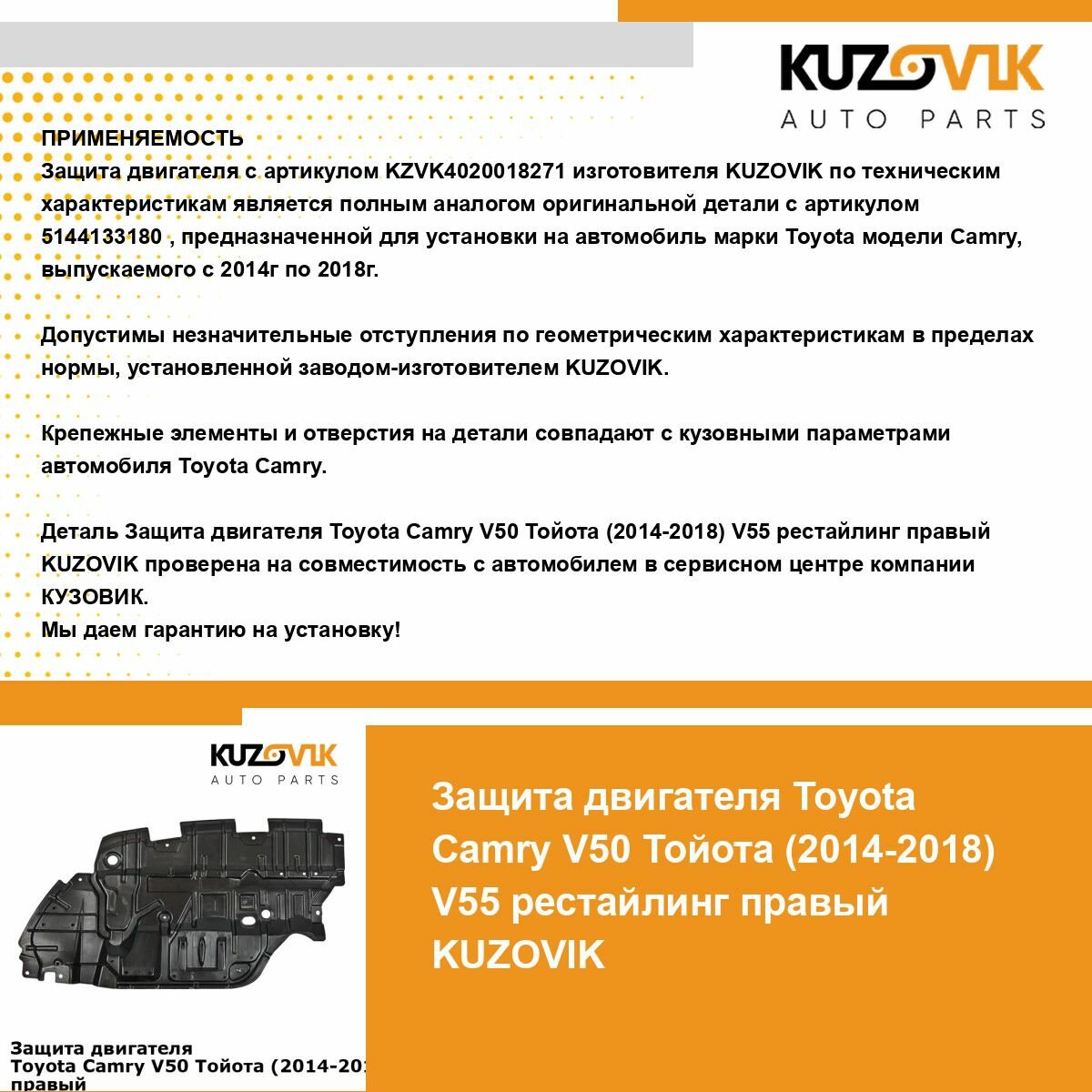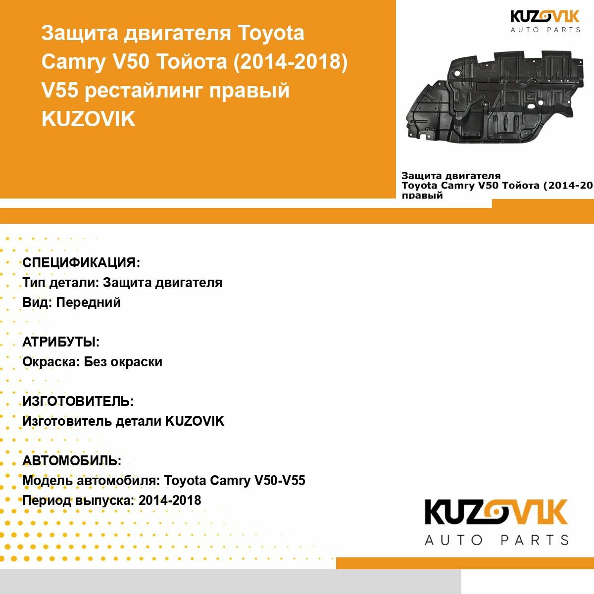 Отзывы на Пыльник защита моторного отсека двигателя правый Toyota Camry V50 Тойота Камри В50 (2014-2018) V55 В55 рестайлинг