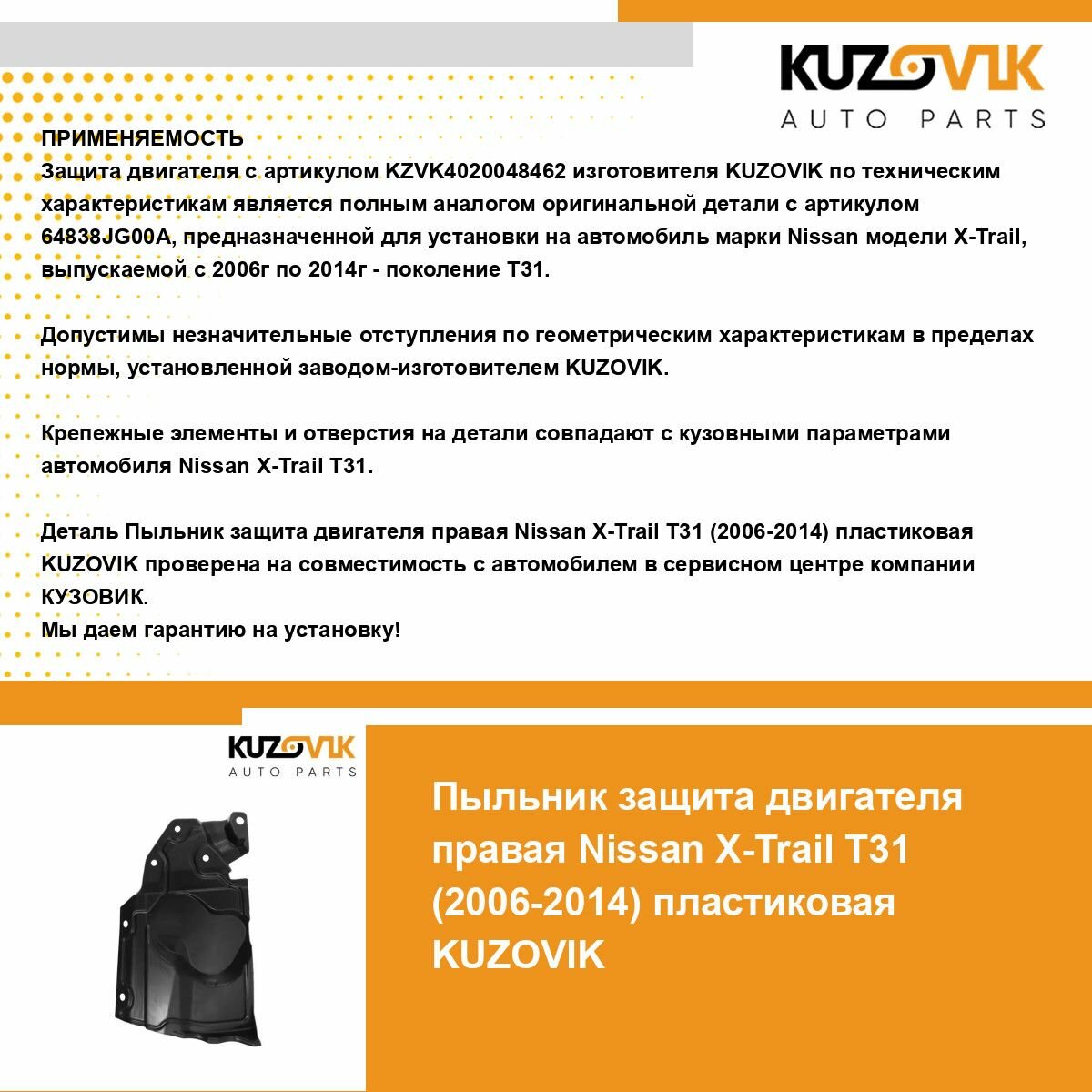 | Подробная комплектация | Защита пыльник двигателя, моторного отсека для Ниссан Икс-Трейл Nissan X-Trail T31 (2006-2014) пластиковый правый |