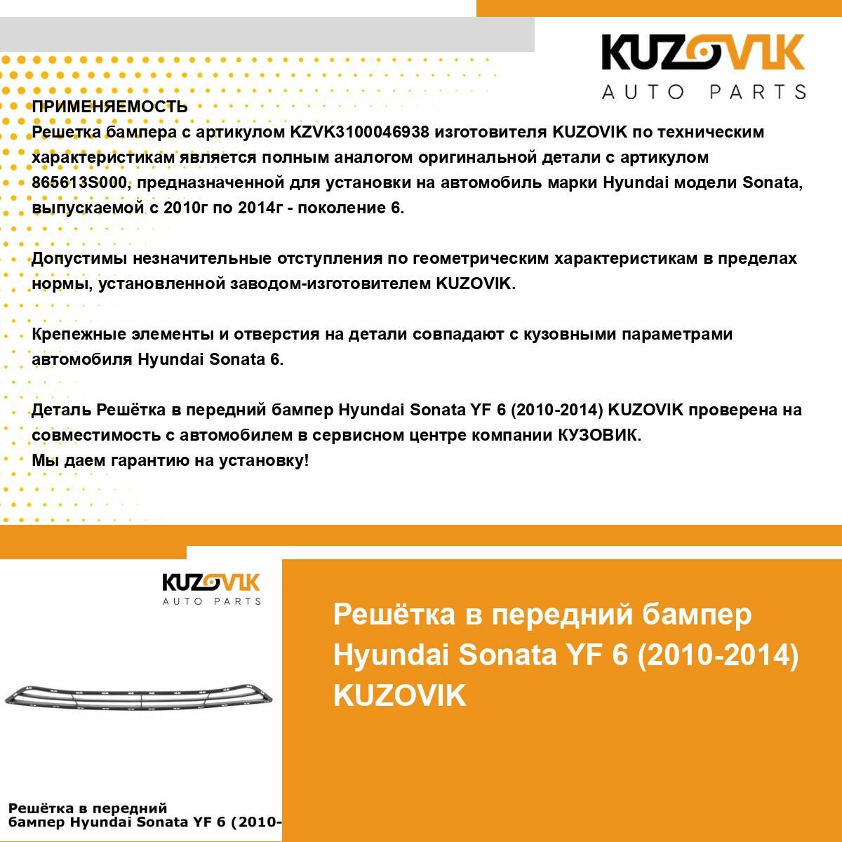 | Подробная комплектация | Решетка переднего бампера для Хендай Соната Hyundai Sonata YF 6 (2009-2014) нижняя |