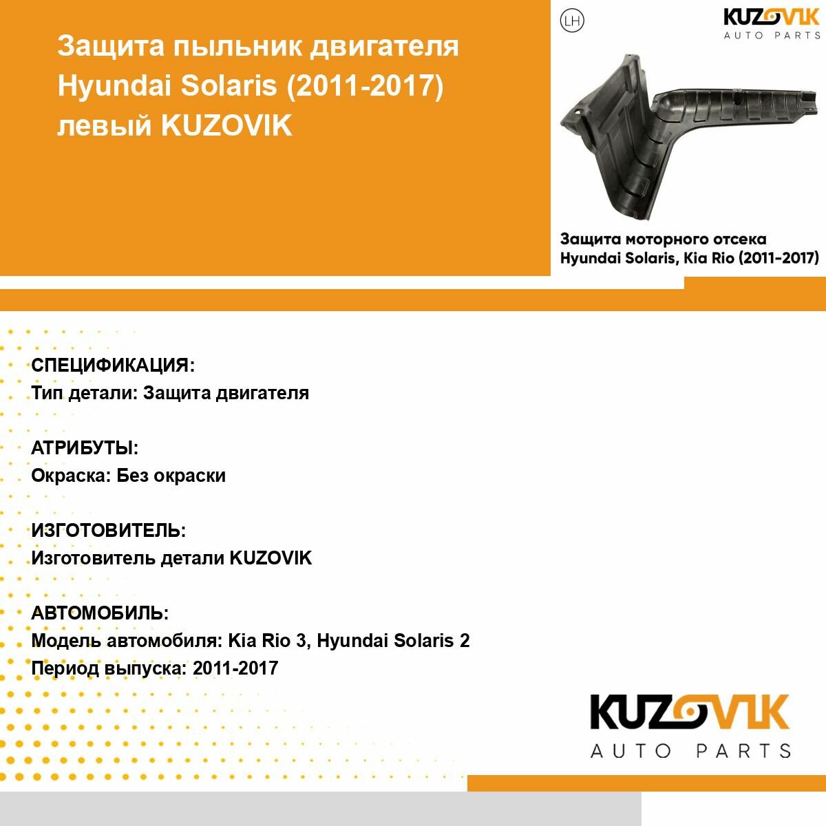 Отзывы на Защита пыльник двигателя Hyundai Solaris Хендай Солярис, Kia Rio Киа Рио (2011-2017) левый