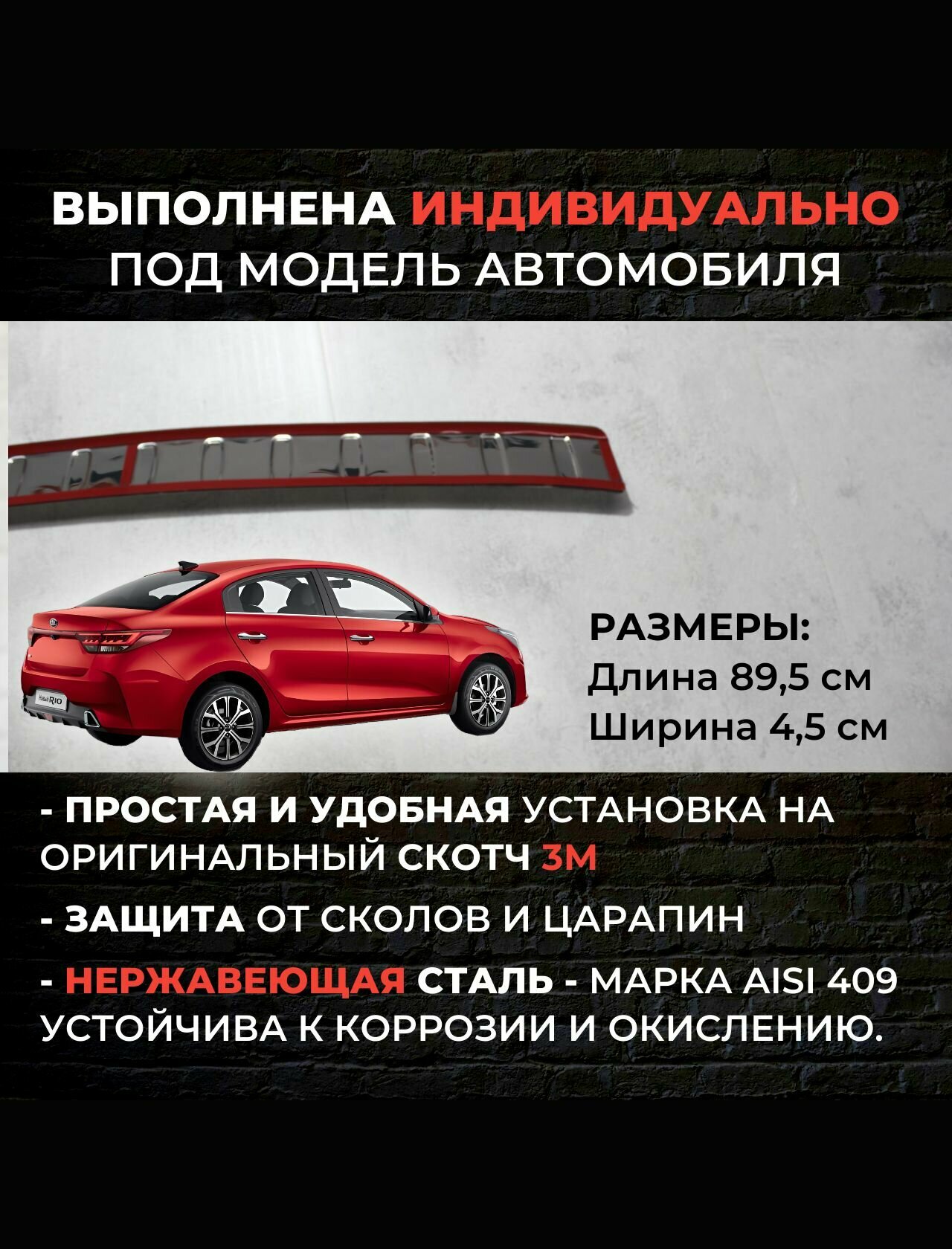 | Дополнительная информация | накладка на задний бампер из нержавеющей стали это стильный и функциональный аксессуар для вашего автомобиля, она предотвращает царапины, сколы и другие повреждения бампер, установка проста, без специальных инструментов, нержавеющая сталь обеспечивает надежную защиту от коррозии, накладка добавляет элегантности и стиля задней части автомобиля, придавая ему уникальный вид |