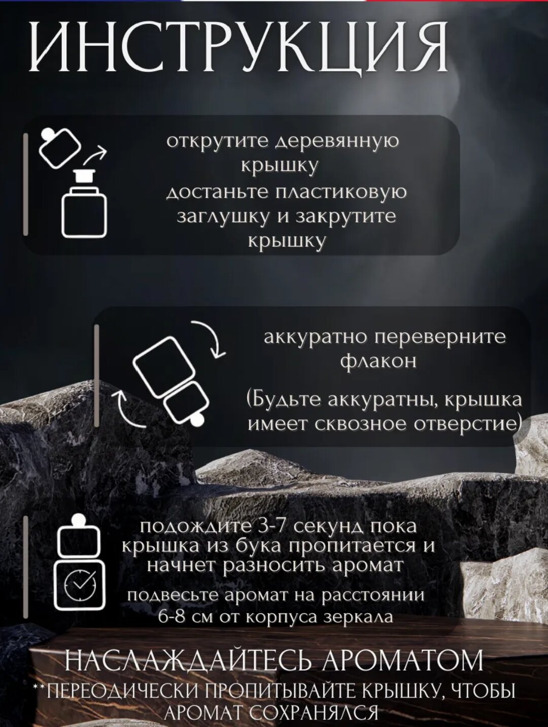 | Комплектация | стеклянный флакон , деревянная крышка и автопарфюм 8мл |