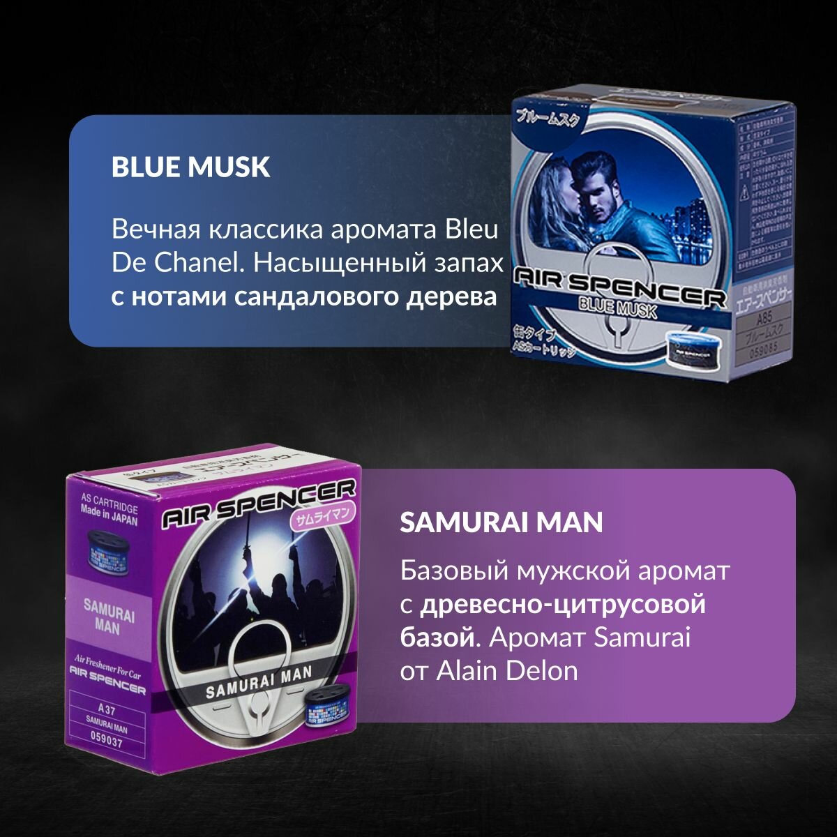 10 цен на EIKOSHA Набор ароматизаторов для машины и дома Spirit Refill - SAMURAI MAN, BLUE MUSK / самурай, ледяной шторм, автомобильный парфюм (арт. A-37, A-85)