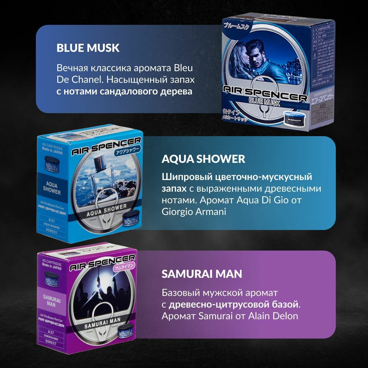 Набор ароматизаторов в машину EIKOSHA Spirit Refill A-85, A-37, A-31, меловой, Япония, оригинал, автомобильный парфюм информация: