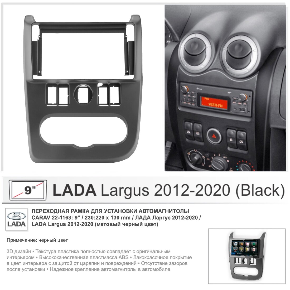 Переходная рамка Lada Largus 2012-2021, Renault Logan 2010-2014, 9" (черная) информация: