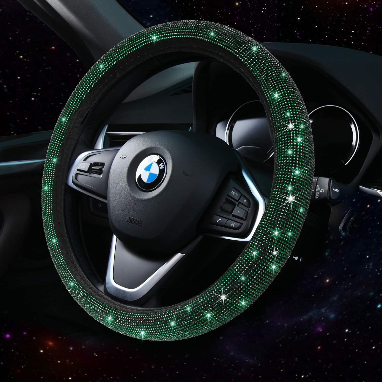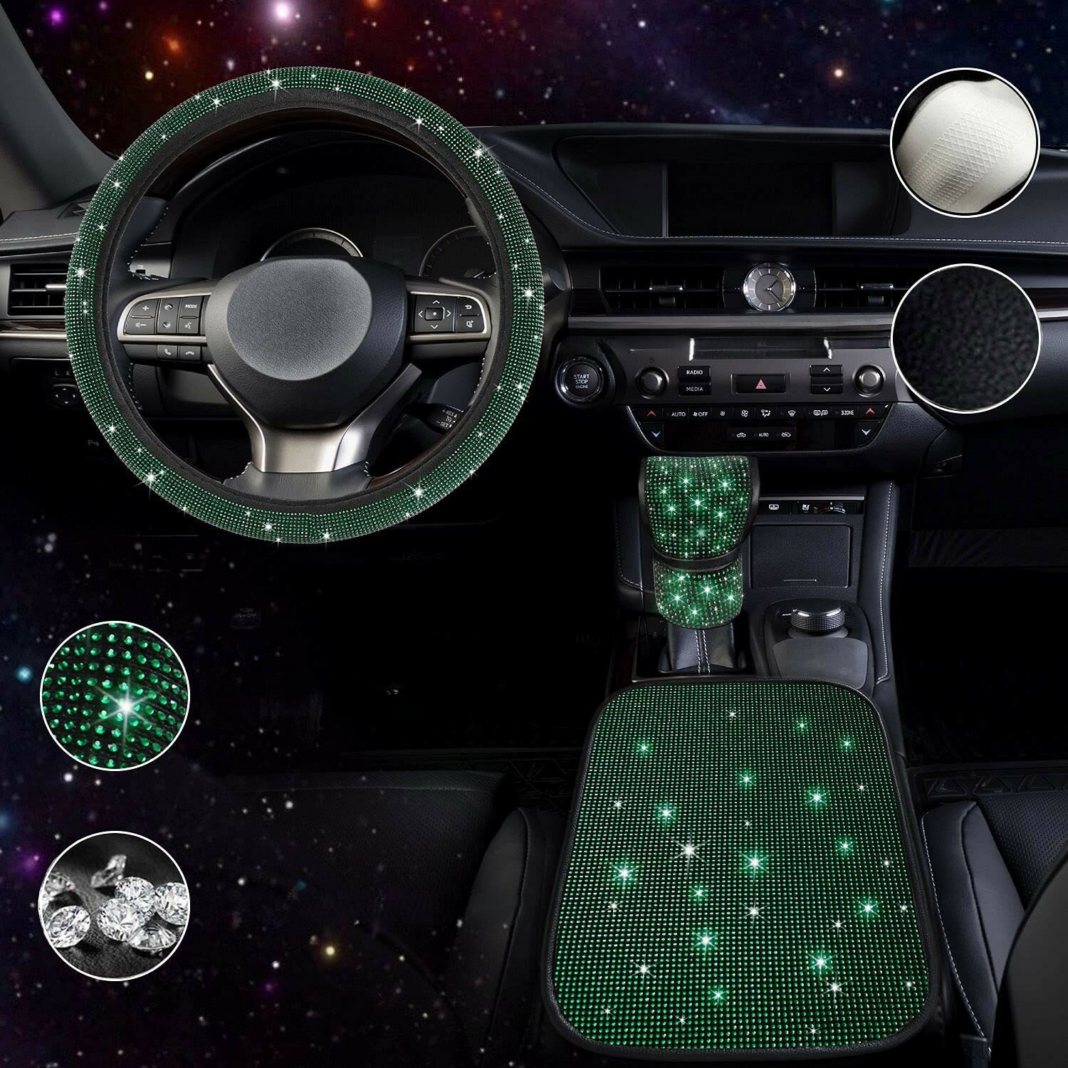 Отзывы на Набор из 3х предметов: оплетка, чехол и накладка для салона авто со стразами, зеленый
