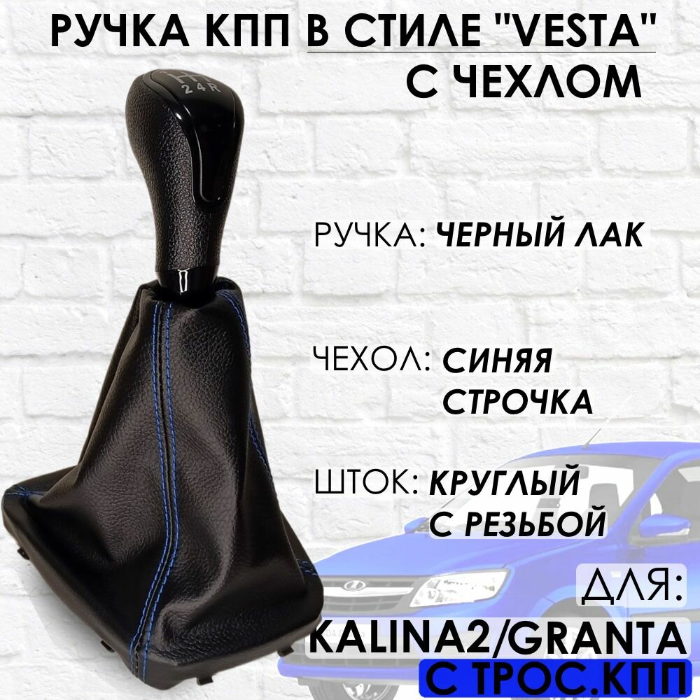 Ручка КПП с чехлом для Granta/Kalina 2/Datsun, c 2013 г. в, "Веста стиль", (Черный лак/синяя строчка) информация: