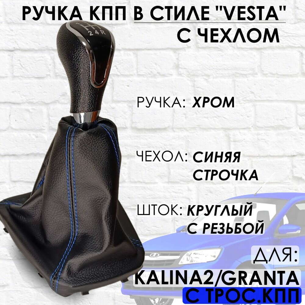 Ручка КПП с чехлом для Granta/Kalina 2/Datsun, c 2013 г. в, "Веста стиль", (Хром/синяя строчка) информация: