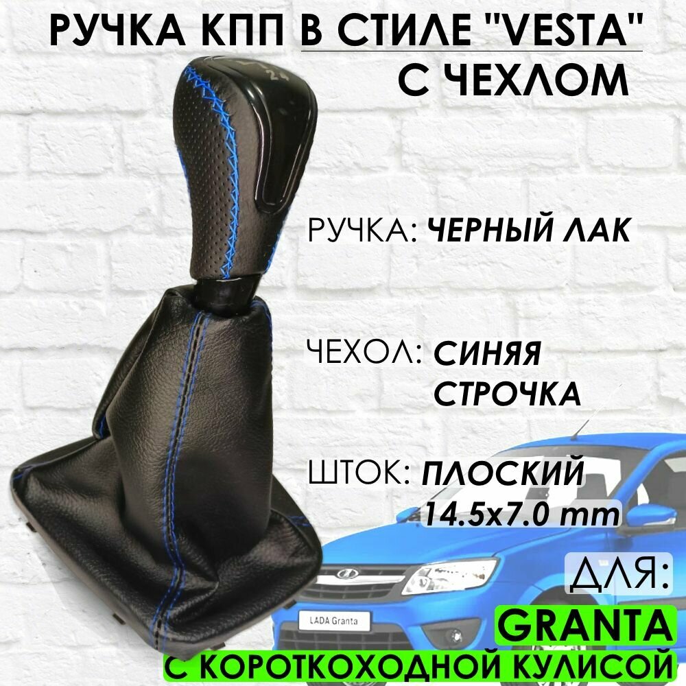 Кожаная Ручка КПП Granta С короткоходной кулисой "Веста стиль" (Черный лак/синяя строчка) информация: