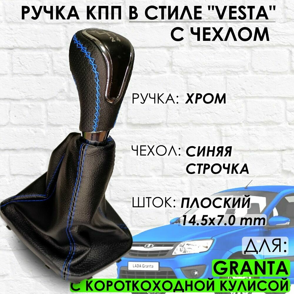 Кожаная Ручка КПП Granta С короткоходной кулисой "Веста стиль" (Хром/синяя строчка) информация: