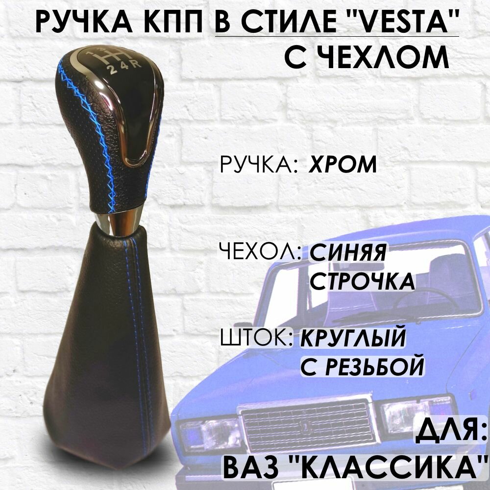 Кожаная Ручка КПП с чехлом ВАЗ "Классика" "Веста стиль" (Хром/синяя строчка) информация: