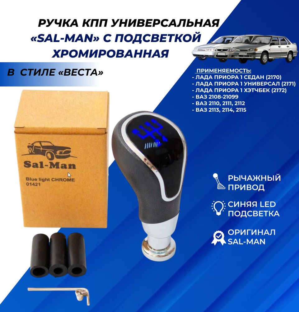 Ручка КПП синяя LED подсветка Sal-Man в стиле Веста, рычажный привод, хром Лада Приора / ВАЗ 2113 2114 2115 / 2108 2109 21099 / 2110 2111 2112 арт.01421 информация: