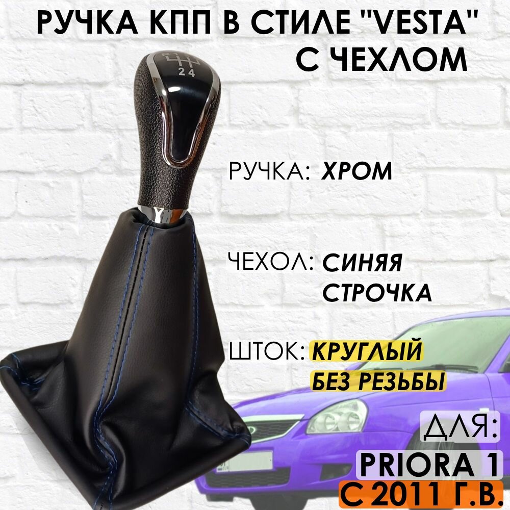 Ручка КПП с чехлом для Lada Priora 1, 2011-2013 г. в, "Веста стиль" (Хром/синяя строчка) информация: