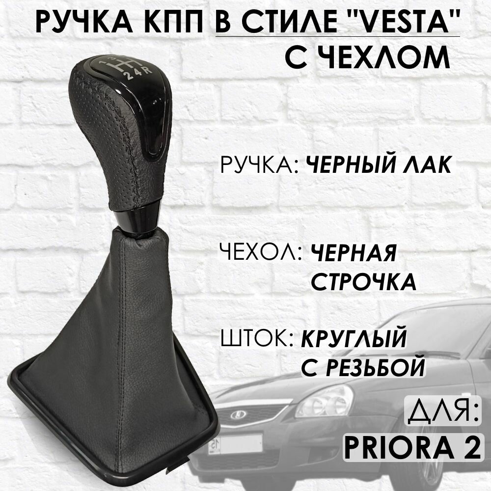Ручка КПП с чехлом для Lada Granta С кулисой до 2013 г. в. "Веста стиль" (Черный лак/черная строчка)