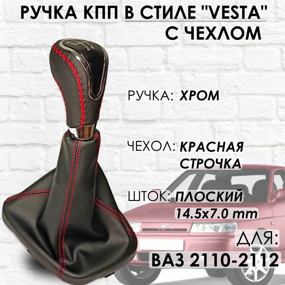 Кожаная Ручка КПП с чехлом ВАЗ 2110-2112 "Веста стиль" (Хром/красная строчка) информация: