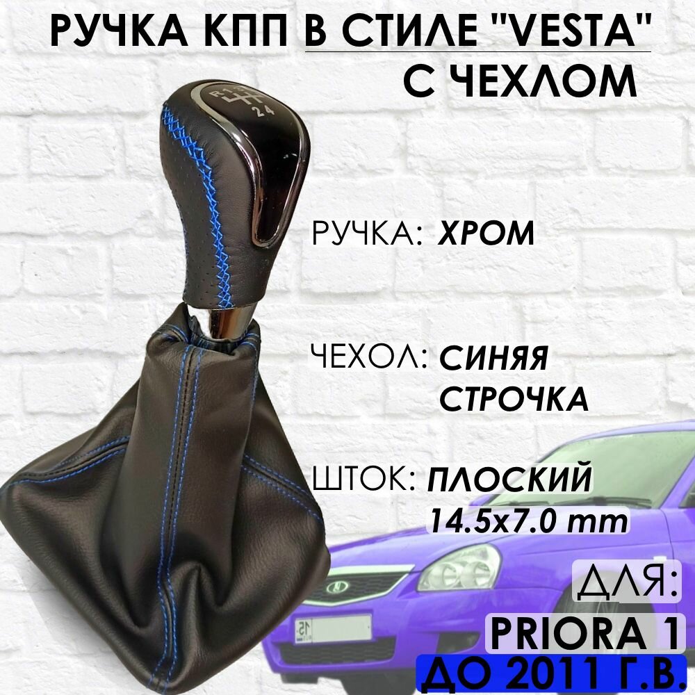 Кожаная Ручка КПП Lada Priora 1, до 2011 г. в, "Веста стиль" (Хром/синяя строчка) информация: