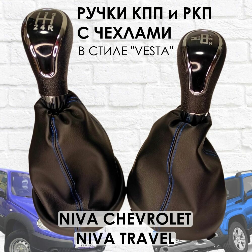 10 цен на Ручки с чехлами на КПП и раздатку Niva Travel/Niva chevrolet Веста стиль (Хром/синяя строчка).