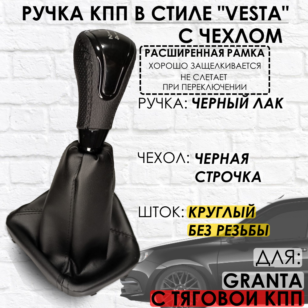 Ручка КПП с чехлом для Lada Granta С кулисой до 2013 г. в. "Веста стиль" (Черный лак/черная строчка)
