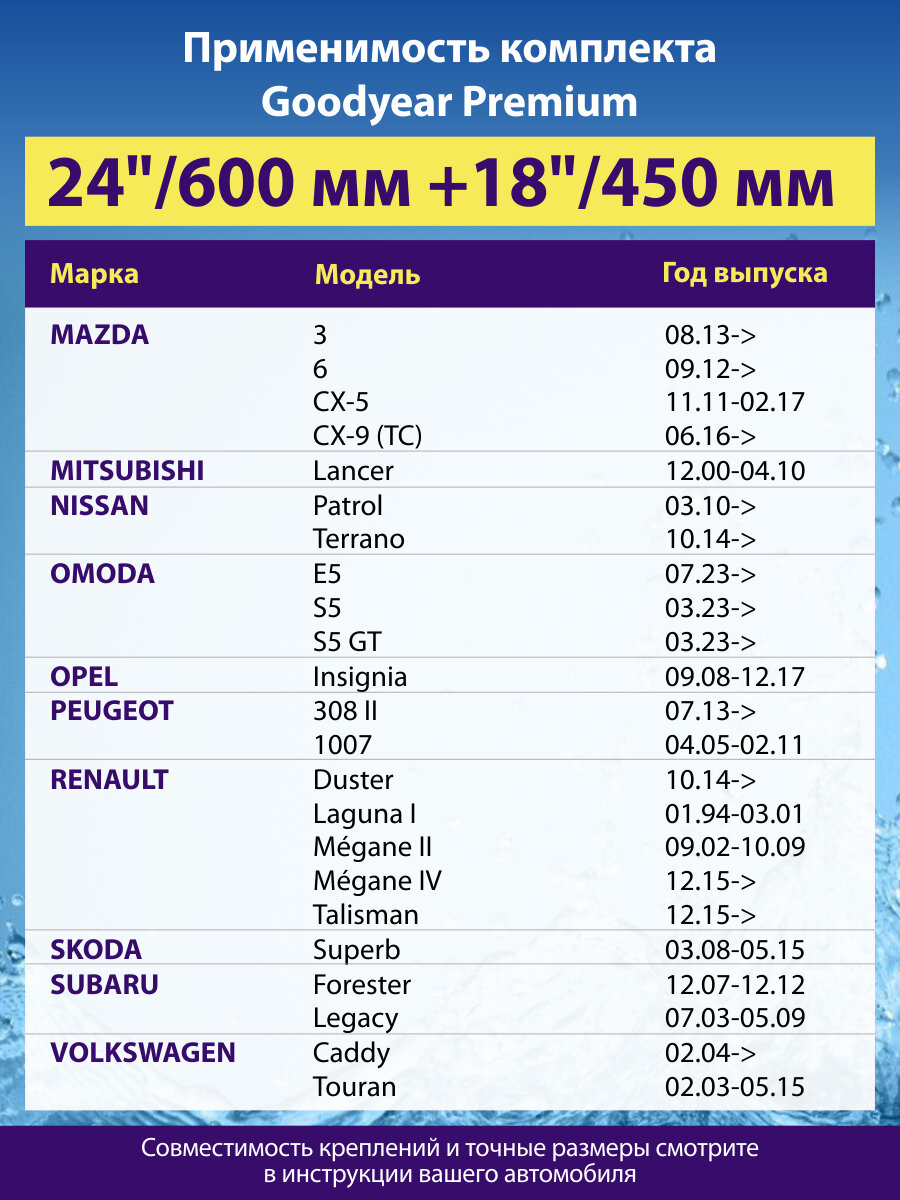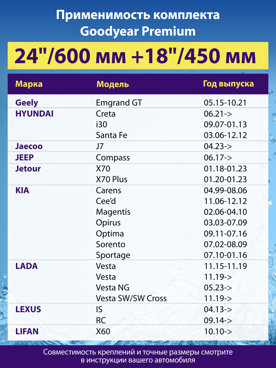 Отзывы на 2 Щетки стеклоочистителя 600 450 мм, Дворники для автомобиля GOODYEAR для Киа Сид 1, Соренто 1, Спортейдж 3, Веста. Для Мазда cx5, Мазда 6 gj (3 БН, БМ), Рено Меган 2