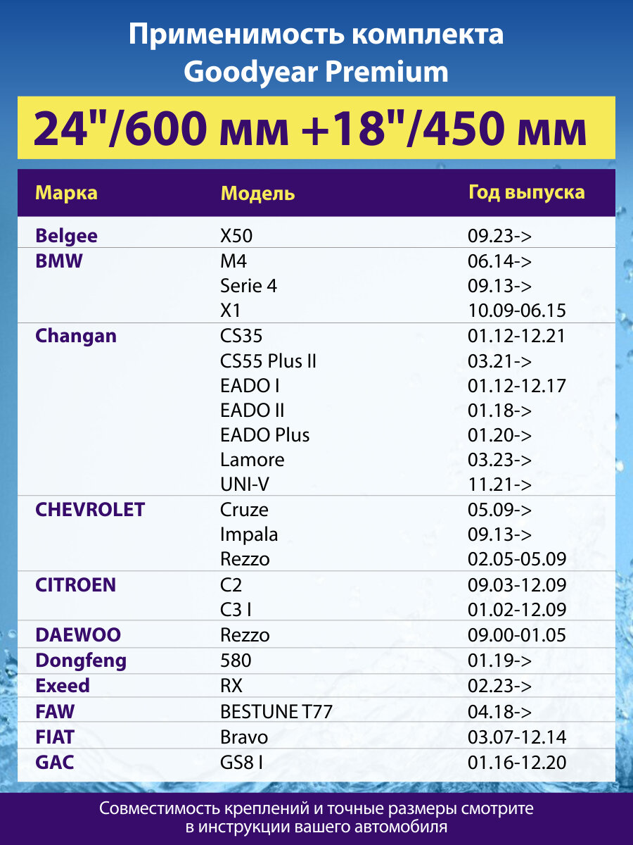 2 Щетки стеклоочистителя 600 450 мм, Дворники для автомобиля GOODYEAR для Киа Сид 1, Соренто 1, Спортейдж 3, Веста. Для Мазда cx5, Мазда 6 gj (3 БН, БМ), Рено Меган 2 информация: