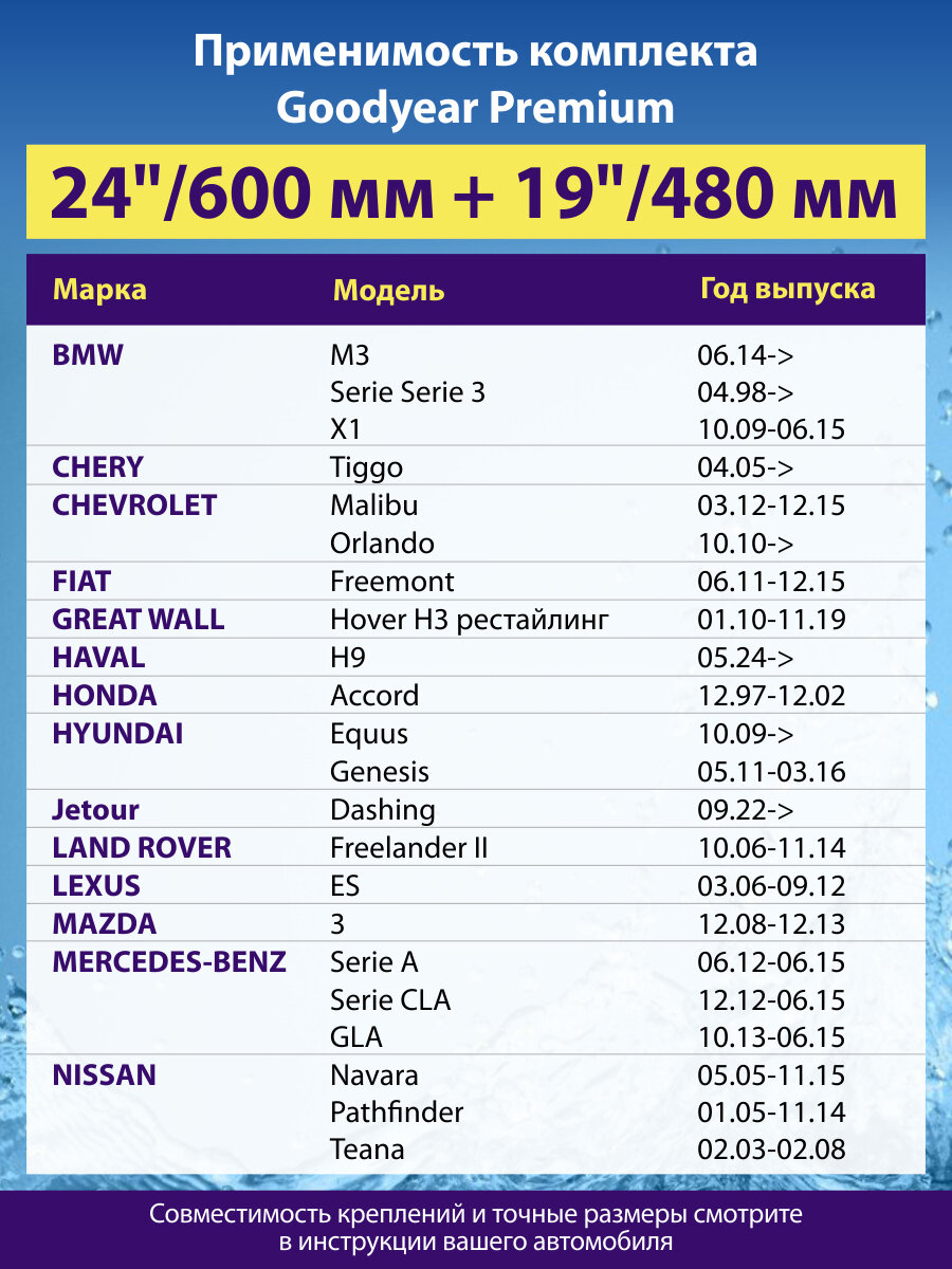 Отзывы на 2 Щетки стеклоочистителя 600 480 мм, Дворники для автомобиля GOODYEAR на Тойота Рав 4, Рено Колеос 1, Мазда 3 бл, Хавал h9, Ниссан Патфайндер р51