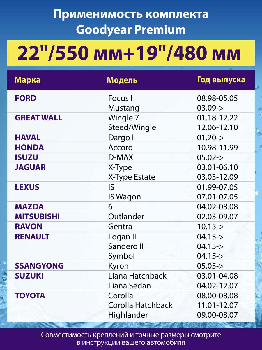 Отзывы на 2 Щетки стеклоочистителя 550 480 мм, Дворники для автомобиля GOODYEAR на Тойота Королла 120 130, Митсубиси Аутлендер 1, Мазда 6 gg gy, Рено Логан 2 Степвей (Сандеро 2)
