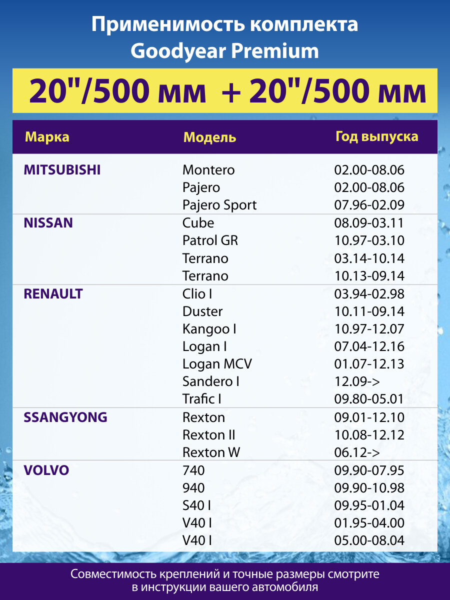 2 Щетки стеклоочистителя 500 500 мм, Дворники для автомобиля GOODYEAR для Приора, Ларгус, ВАЗ 2114, Рено Сандеро 1 (Логан 1). На Нива Тревел Шевроле, Рено Дастер 2013, Газ Газель Бизнес 3302 информация: