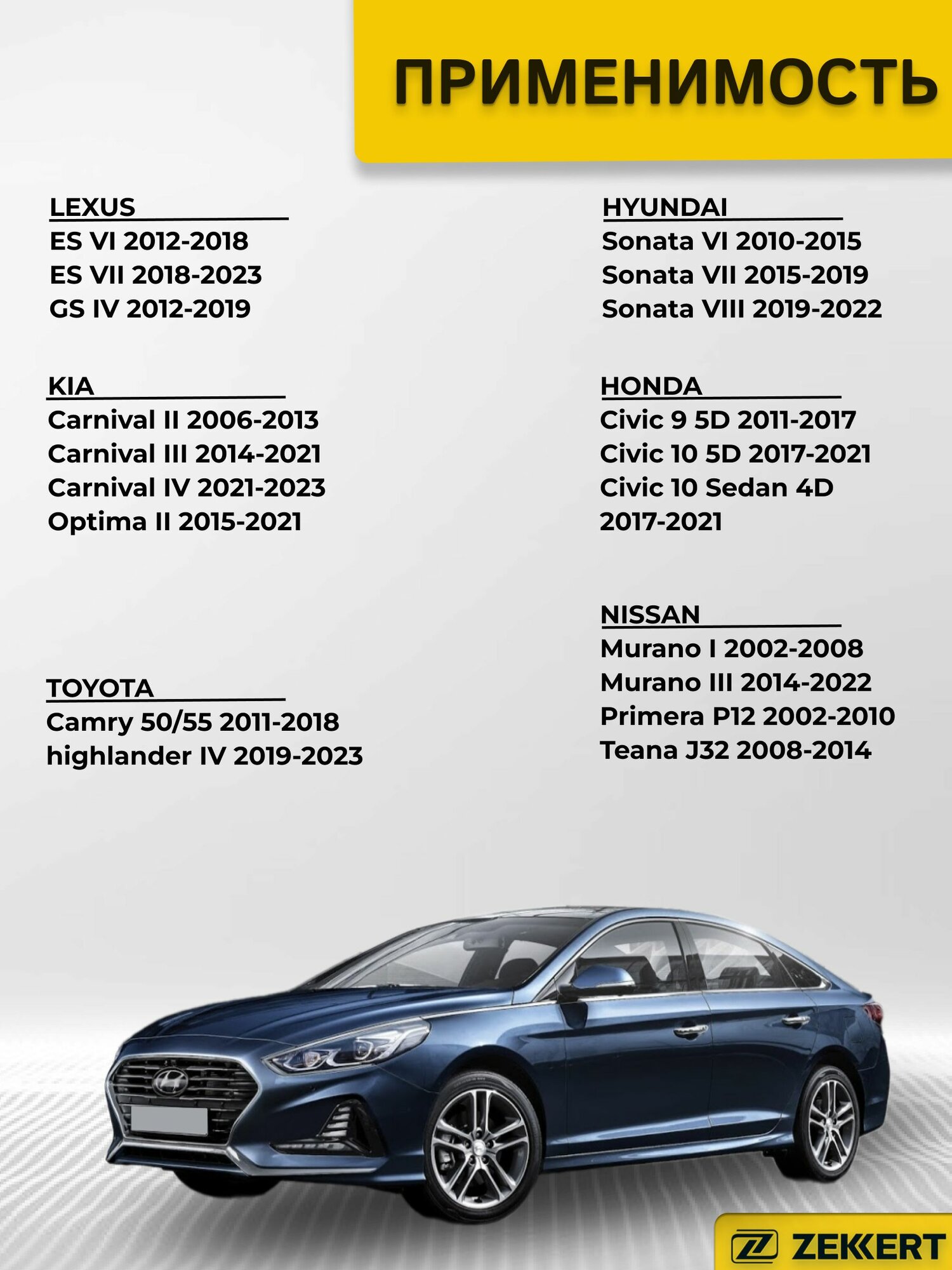 | Модель автомобиля | Chery Tiggo / Chery Tiggo 5 / Ferrari 599 GTB Fiorano / Ford Transit Connect / Genesis G70 / Honda Civic / Honda HR-V / Hyundai Grandeur / Hyundai Sonata / Hyundai Veloster / Kia Carnival / Kia Optima / Kia Stinger / Mitsubishi Outlander / Nissan Almera / Nissan Almera Tino / Nissan Murano / Nissan Teana / Renault Avantime / Renault Espace / Smart Forfour / Toyota Avalon / Toyota Camry / Toyota Highlander / Toyota Prius / 599 / 612 / 612 Scaglietti / A1 / A3 / C5 / CT200h / Carnival (1999-2020) / Connect / ES / Forfour (2004-2020) / G70 (2017-2020) / GS / LS / QX50 / Sonata VIII |