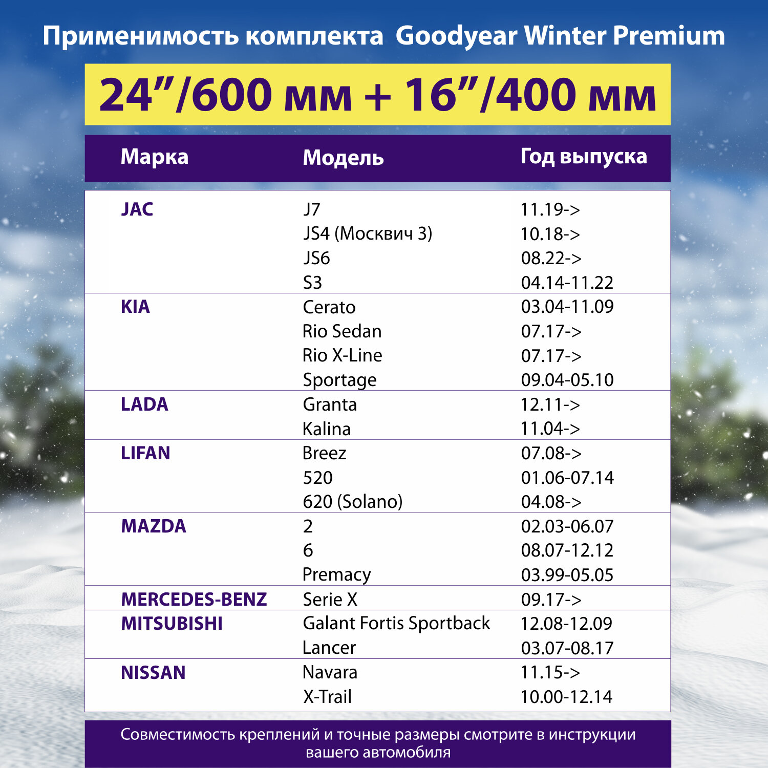2 Щетки стеклоочистителя зимние 600 400 мм, Дворники для автомобиля GOODYEAR для HYUNDAI Solaris/ LADA Granta Kalina / KIA Rio / HAVAL F7 информация: