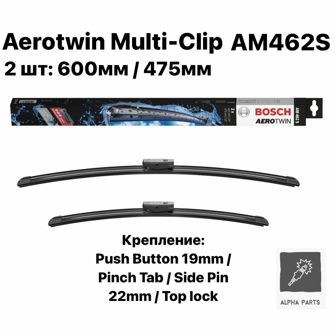 600 475 мм. Push Button 19mm, Pinch Tab, Side Pin 22mm, Top lock. Бескаркасные щетки стеклоочистителя BOSCH Aerotwin AM462S (Бош Аэротвин) дворники арт. 3397007462