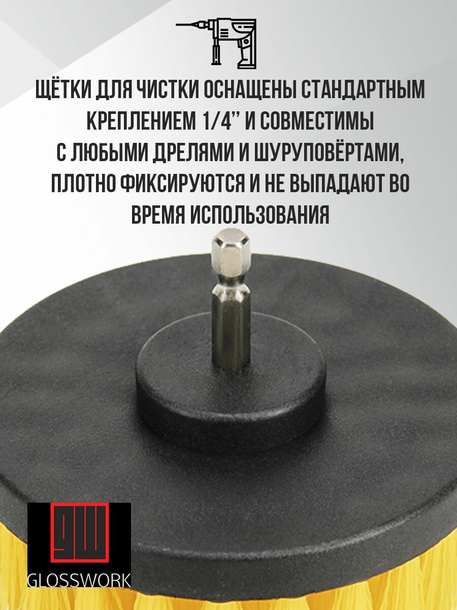 10 цен на GLOSSWORK Щетка для химчистки, насадка для дрели и шуруповёрта, желтая щетина средней жесткости
